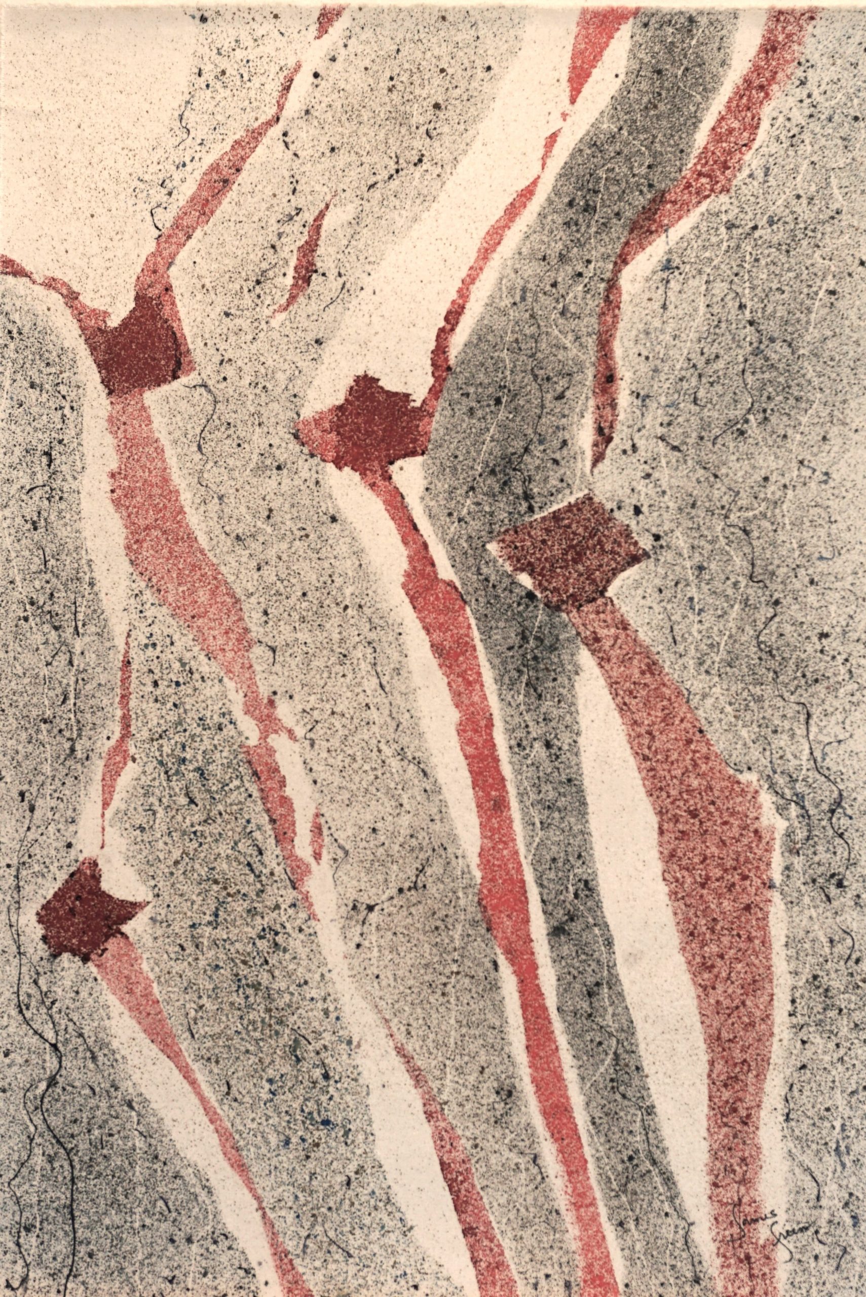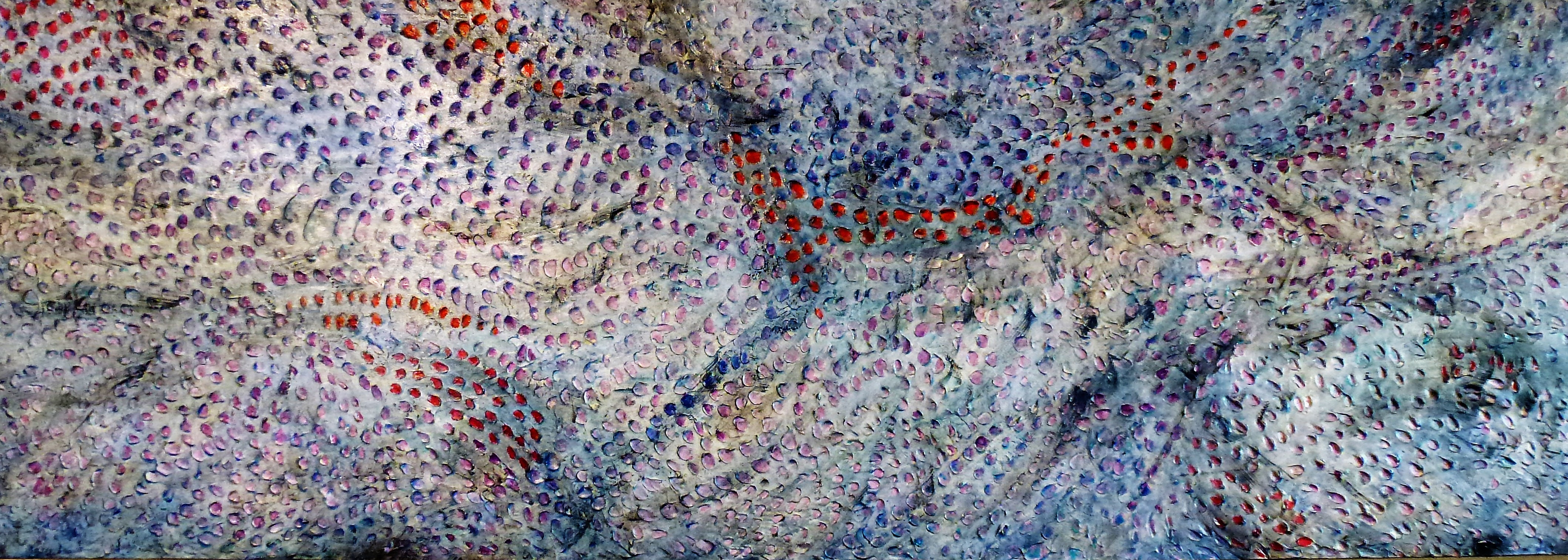 A separate group of acrylics I refer to as energy pieces. These express a sense of motion, force or matter through space. I use a heavy gesso base, with laying of acrylics which at times produces a gem like effect of radiating particles.