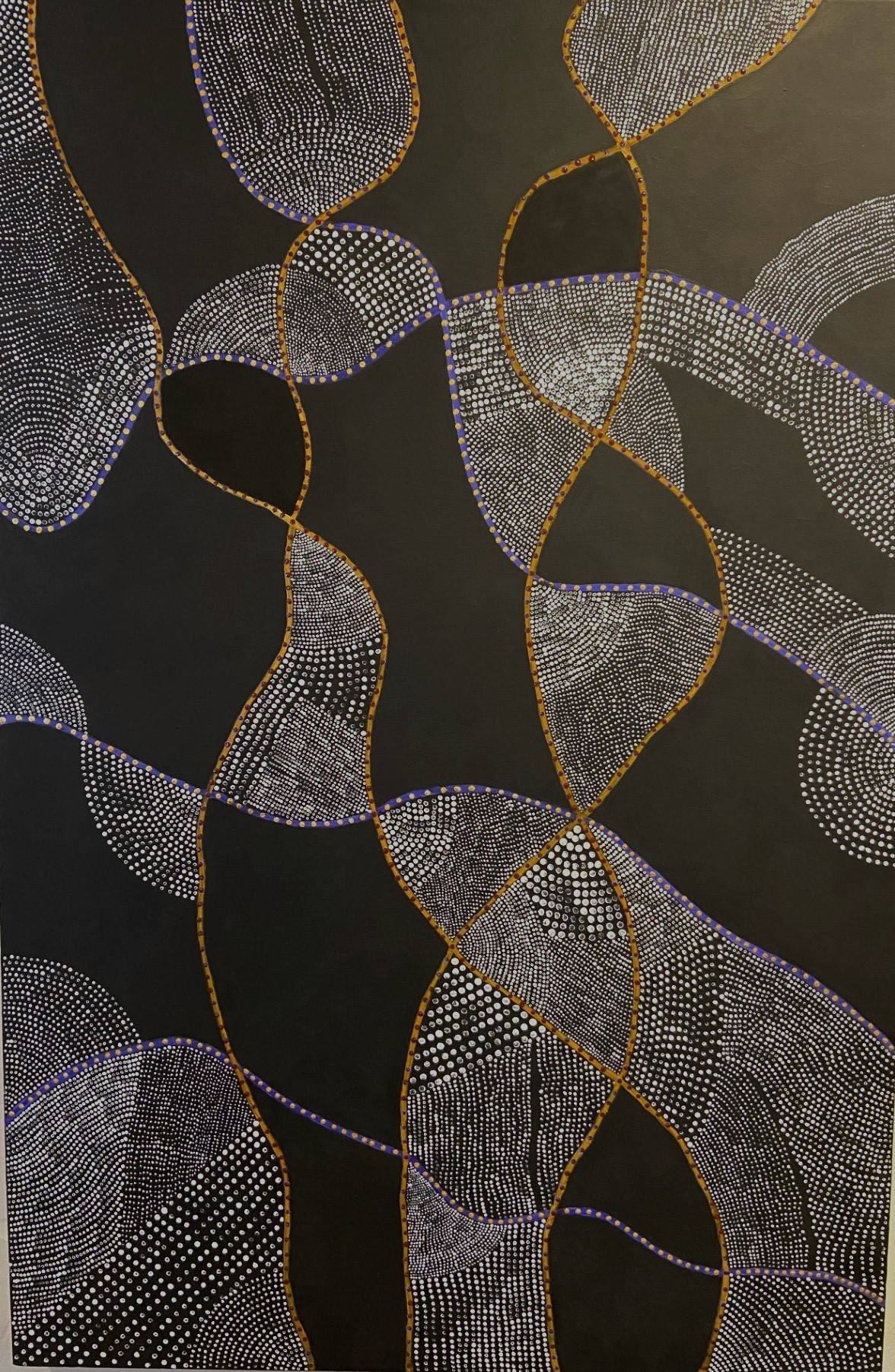 The dot motif, revered for its cultural significance in indigenous Australian Art, serves as the foundation of this artistic expression. I have placed this ancient method of painting into a modern abstract approach. The dots on a black void can be considered pixels, signifying the intersection of our digital age with the timeless beauty of indigenous artistry.